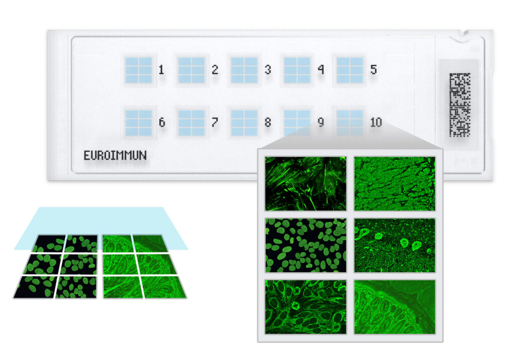 Euroimmun’s BIOCHIP technology enables simultaneous detection of multiple autoantibodies on a single slide. This multiplex format increases diagnostic efficiency, reduces sample volume, and ensures standardized results across laboratories.